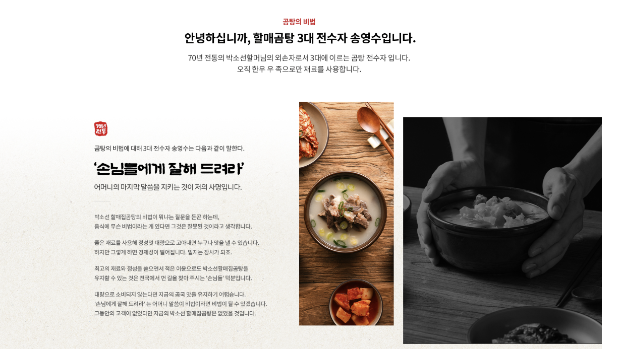현풍할매 외손자집 곰탕은 1950년대부터 시작된 전통 맛집입니다. 박소선 할머니의 손맛을 3대째 물려받아, 외손자인 송영수씨가 현재까지 그 전통을 이어가고 있습니다. 70년의 전통과 함께한 깊고 진한 국물 맛은 많은 고객들에게 큰 사랑을 받고 있으며, 그 맛을 계속 이어가기 위해 프랜차이즈 형태로 사업을 확장하게 되었습니다.!